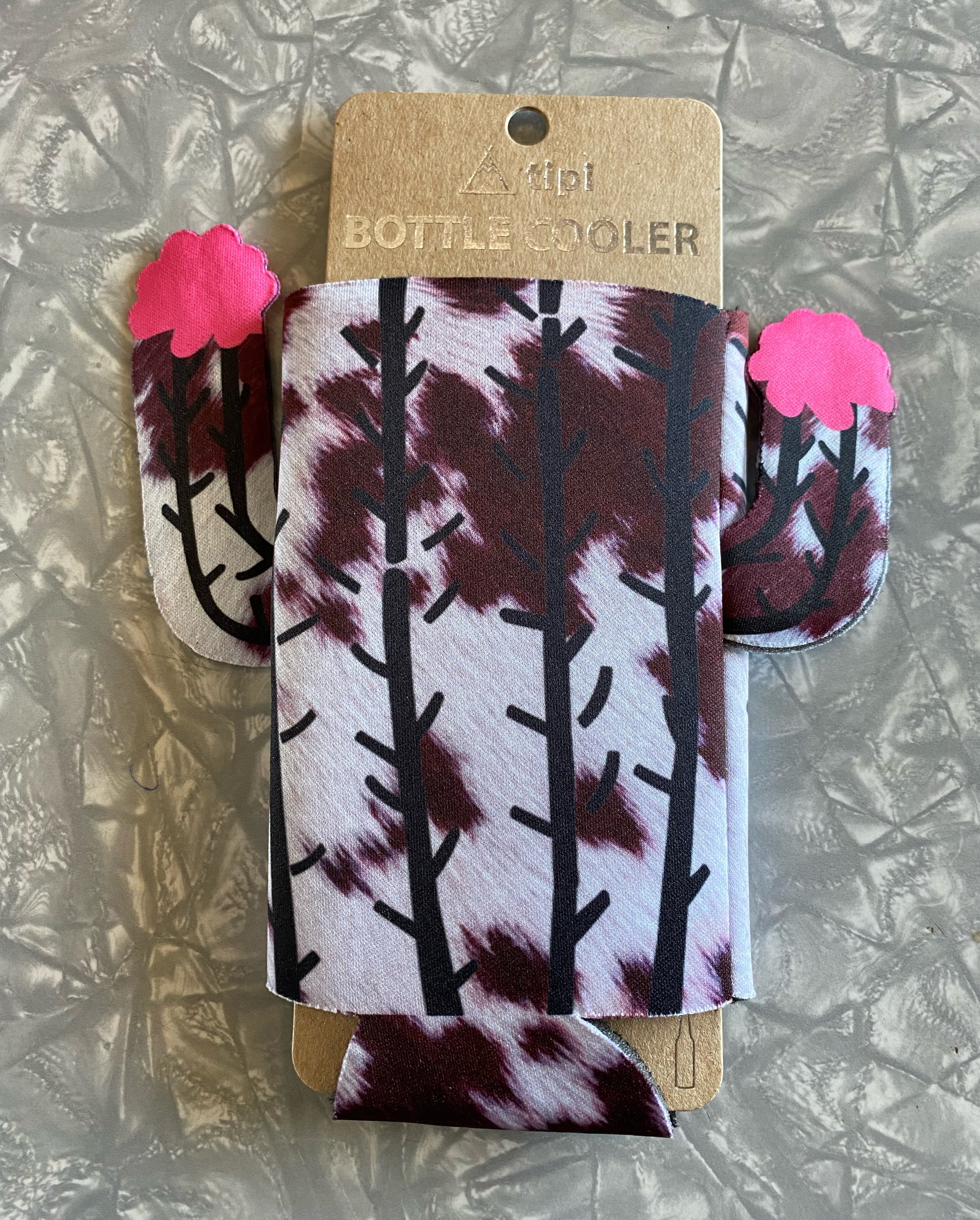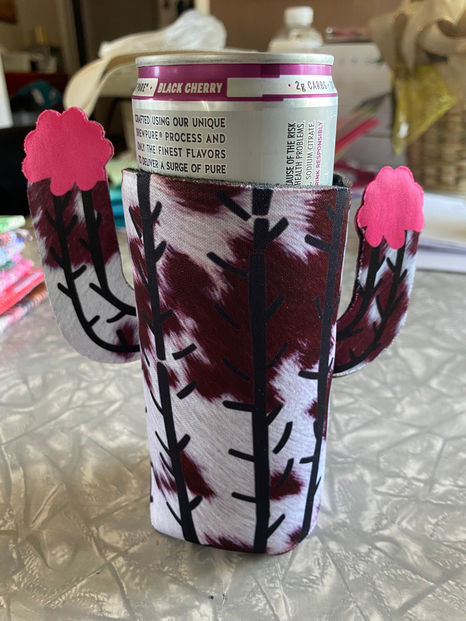This is a fun cactus shaped slim coozie with brown cow colored and cute little flowers. This fits tall slim cans and bottles.