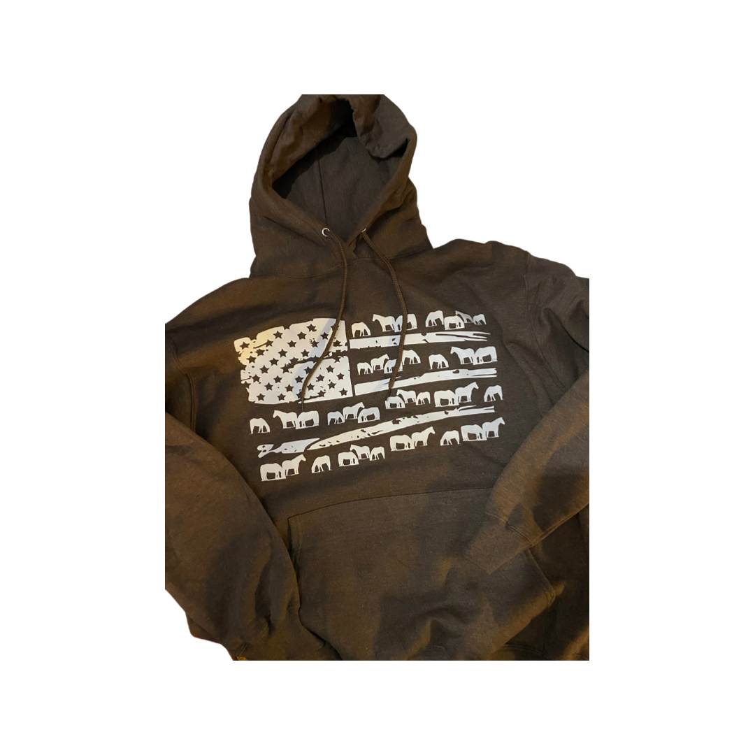Get your exclusive flag/horse sweatshirt here! Designed by Buckin D! Heathered Chocolate Hoodie is a 50/50 cotton/poly fleece. Mens sizing. See sizing chart for more info. Larger sizes are slightly more. Larger sizes can be ordered depending on availability.