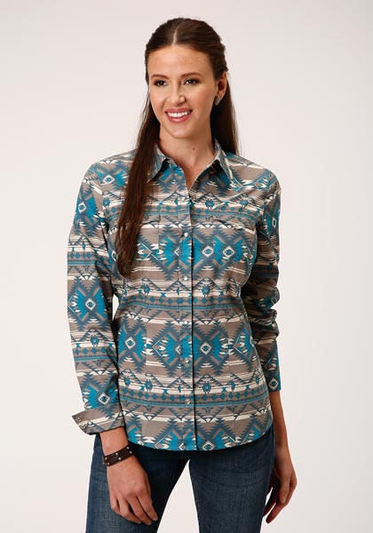 Ladies Roper L/S Khaki Aztec Horizontal Print western shirt is 100% Cotton Poplin. Front and back yokes, Pockets, Pearl Snap Front and cuffs. Waist and busts darts.