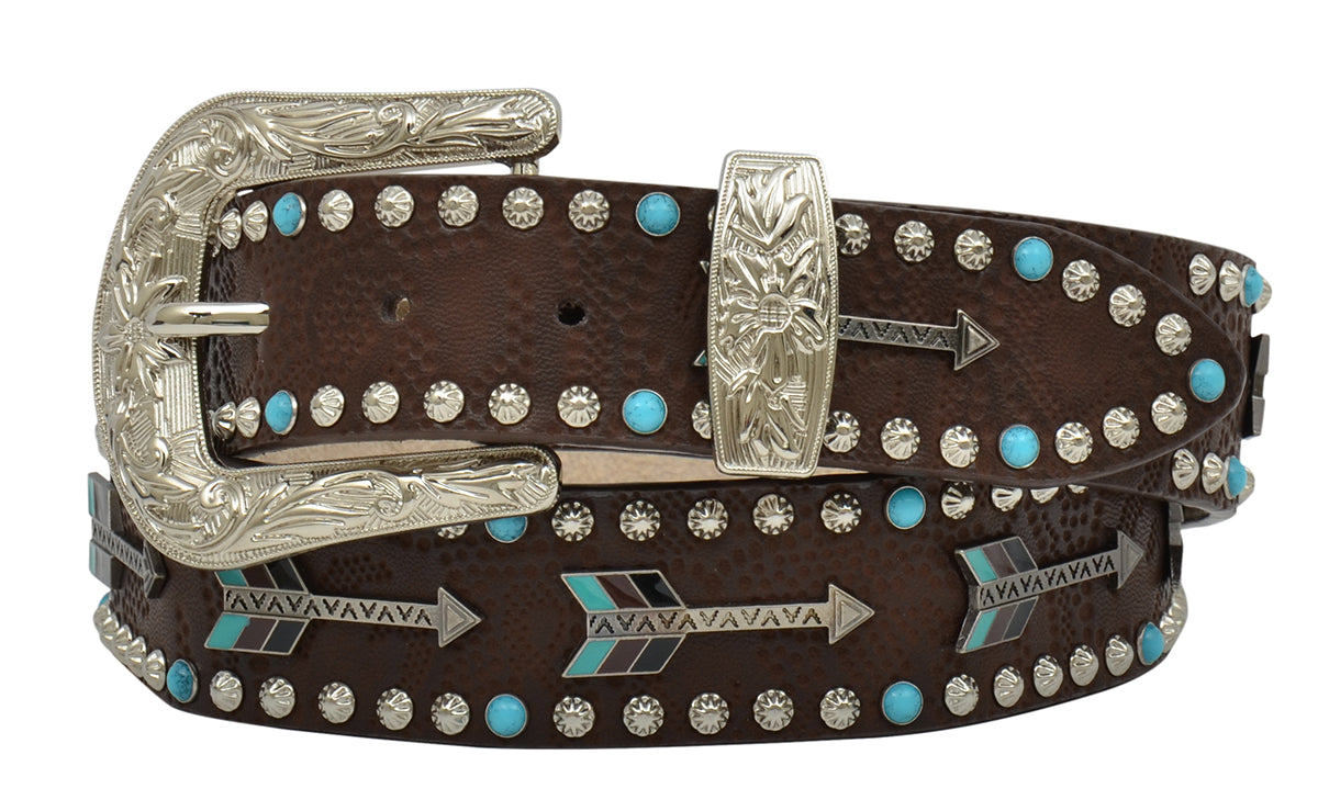 Women's Angel Ranch Arrow & Turquoise Belt is made with genuine leather and decorated with beautiful arrow shaped conchos and silver and turquoise dots.